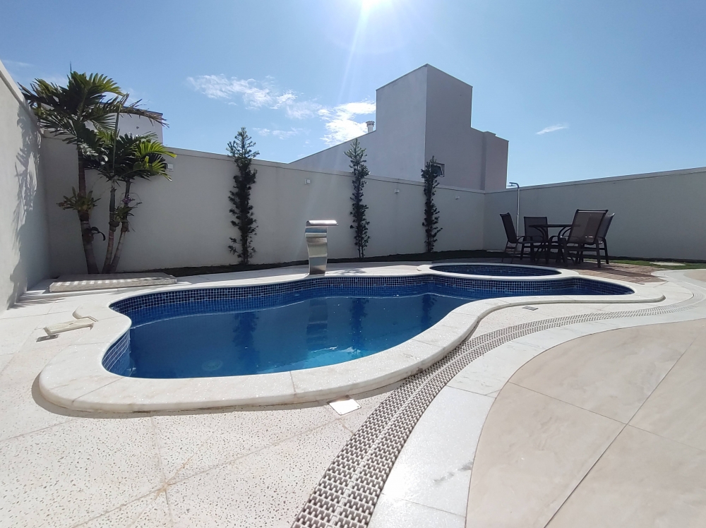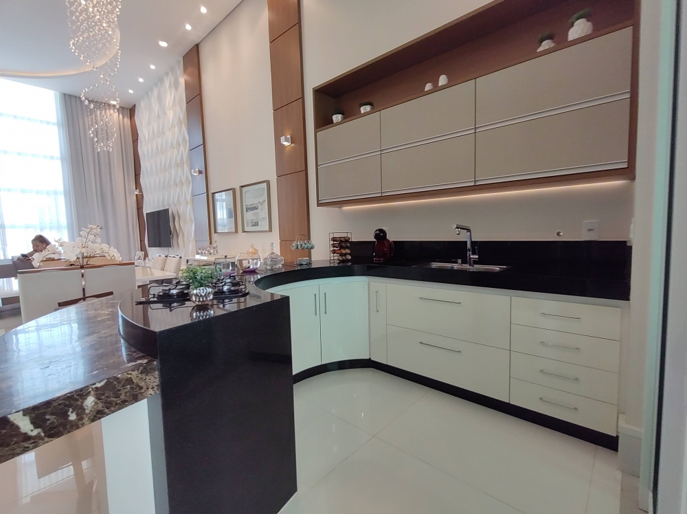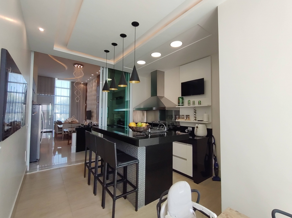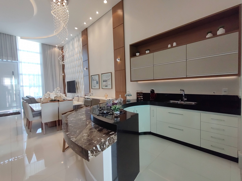 3 quartos com armários sendo 1 suíte com closet, 2 quartos estilo americano, sala de estar, sala de jantar, lavabo, cozinha planejada, área de serviço com armários, espaço gourmet com churrasqueira, banheiro externo, piscina, garagem para 2 carros.