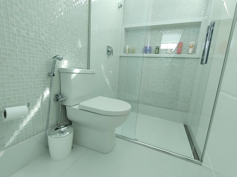 Acabamento com porcelanato, aquecimento solar na piscina, torneiras e chuveiros,
